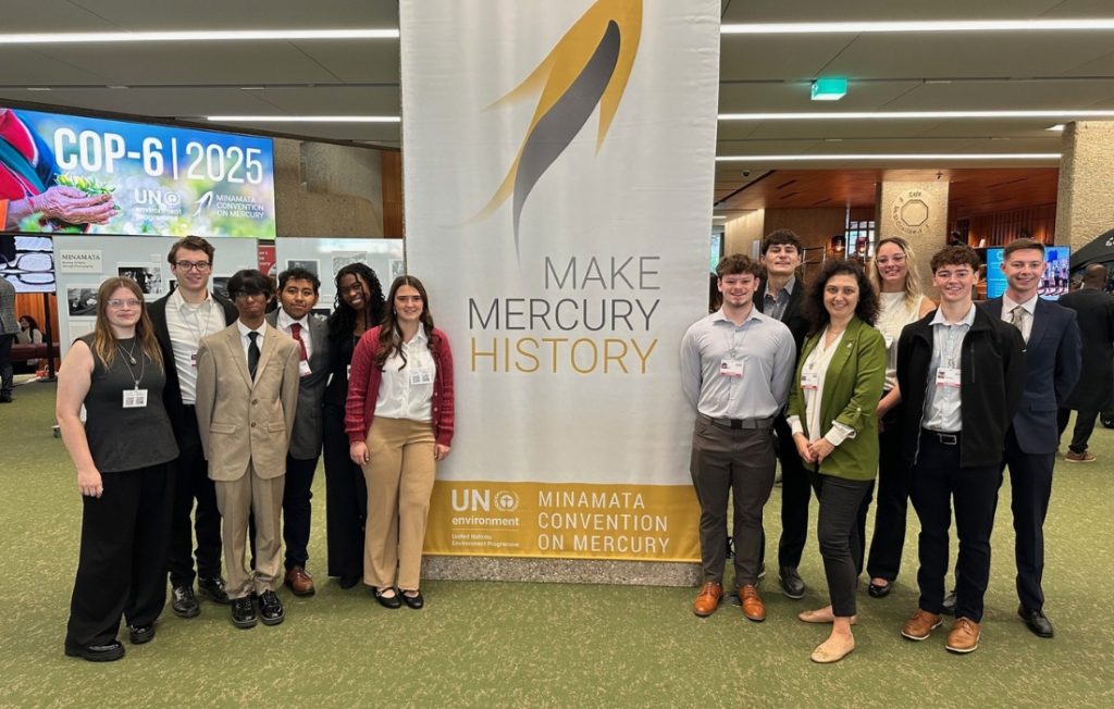 Eleven students from Todorova’s class traveled to Geneva to attend the sixth meeting of the Conference of the Parties to the Minamata Convention on Mercury (COP-6), representing Syracuse University on a global stage. As official delegates to COP-6, the group was able to attend official briefings, plenary sessions, and “contact groups”—small working groups for specific policy issues. The students also met one-on-one with the United States delegation and participated in drafting a Youth Declaration with the Chemical and Waste Youth group, adding their voices to the next generation of environmental advocates.